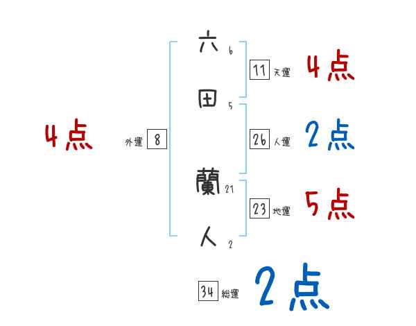 天運![]() | 六田蘭人さんの天運は11画の4つ星!着実に富や地位を得る幸運な人生。 家系が持つ宿命的な運勢を表します。祖先から受け継いだ苗字ですので自分の力が及びません。家柄を象徴します。 |