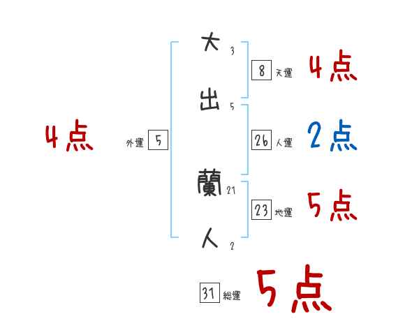 外運![]() | 大出蘭人さんの外運は5画の4つ星!健康で安泰。協調性に優れ、財産に恵まれる。 生活面を象徴する運勢です。外部から受ける影響力を表し、結婚運、家庭運や職場、環境への順応性を表します。 |