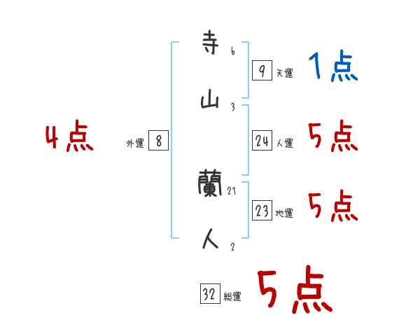 総運![]() | 寺山蘭人さんの総運は32画の5つ星!柔軟性があり成功する。チャンスが多く金運が良い。 あなたの人生を表す1番重要な運勢です。生涯を通じて影響する総合運となり、主に50歳以降の晩年期に影響を及ぼします。 |