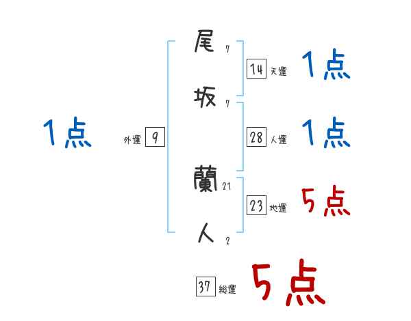 人運![]() | 尾坂蘭人さんの人運は28画の1つ星!家庭環境に注意。スポーツで活躍できる能力があるかも。 性格や才能などを表す2番目に重要な運勢です。人間関係や協調性、社会的な成功に影響します。主に20歳から50歳ぐらいまでの中年期の運勢を表します。 |