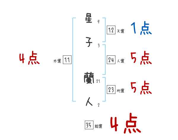 総運![]() | 星子蘭人さんの総運は35画の4つ星!温厚な性格で感受性が高い。穏和な性格で人望が厚い。 あなたの人生を表す1番重要な運勢です。生涯を通じて影響する総合運となり、主に50歳以降の晩年期に影響を及ぼします。 |