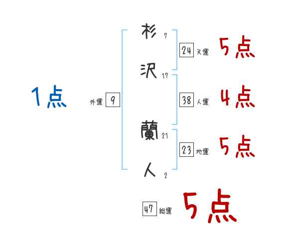 天運![]() | 杉沢蘭人さんの天運は24画の5つ星!家庭運が良く順調な人生。金運にも恵まれる。 家系が持つ宿命的な運勢を表します。祖先から受け継いだ苗字ですので自分の力が及びません。家柄を象徴します。 |