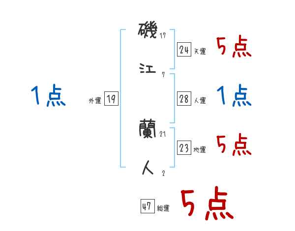 天運![]() | 磯江蘭人さんの天運は24画の5つ星!家庭運が良く順調な人生。金運にも恵まれる。 家系が持つ宿命的な運勢を表します。祖先から受け継いだ苗字ですので自分の力が及びません。家柄を象徴します。 |
