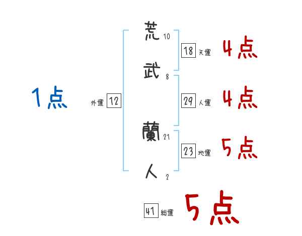 天運![]() | 荒武蘭人さんの天運は18画の4つ星!情熱的で剛気。忍耐力があり信頼される。 家系が持つ宿命的な運勢を表します。祖先から受け継いだ苗字ですので自分の力が及びません。家柄を象徴します。 |