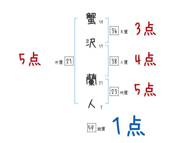 外運![]() | 蟹沢蘭人さんの外運は21画の5つ星!統率力がある。独立し成功する。名誉を手に入れる。 生活面を象徴する運勢です。外部から受ける影響力を表し、結婚運、家庭運や職場、環境への順応性を表します。 |