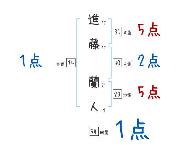 天運![]() | 進藤蘭人さんの天運は31画の5つ星!社交性があり判断力に優れる。順風満帆な人生で円満な生活。 家系が持つ宿命的な運勢を表します。祖先から受け継いだ苗字ですので自分の力が及びません。家柄を象徴します。 |