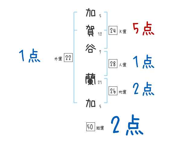 外運![]() | 加賀谷蘭加さんの外運は22画の1つ星!努力することが苦手ないっぽう手先が器用。芸術性にも優れる。 生活面を象徴する運勢です。外部から受ける影響力を表し、結婚運、家庭運や職場、環境への順応性を表します。 |