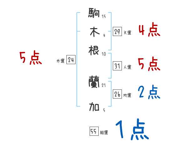 天運![]() | 駒木根蘭加さんの天運は29画の4つ星!完全主義で才能がある。厳格な心の持ち主。 家系が持つ宿命的な運勢を表します。祖先から受け継いだ苗字ですので自分の力が及びません。家柄を象徴します。 |