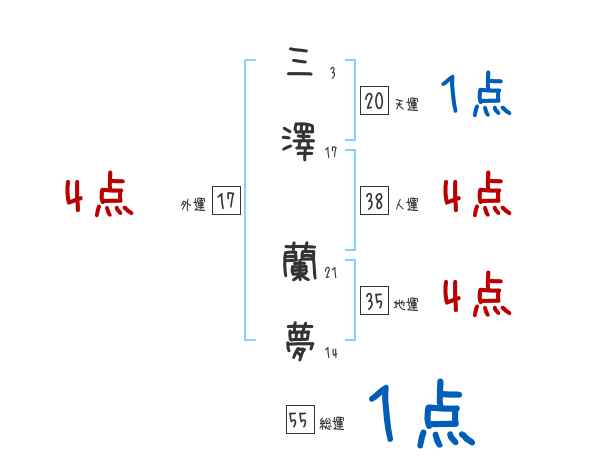 外運![]() | 三澤蘭夢さんの外運は17画の4つ星!積極的な行動力。地位を気づき財産を手に入れる。純粋な心と直感力。 生活面を象徴する運勢です。外部から受ける影響力を表し、結婚運、家庭運や職場、環境への順応性を表します。 |