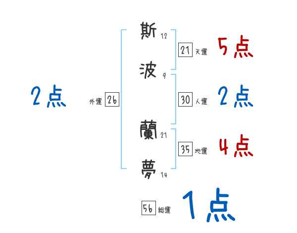 天運![]() | 斯波蘭夢さんの天運は21画の5つ星!統率力がある。独立し成功する。名誉を手に入れる。 家系が持つ宿命的な運勢を表します。祖先から受け継いだ苗字ですので自分の力が及びません。家柄を象徴します。 |