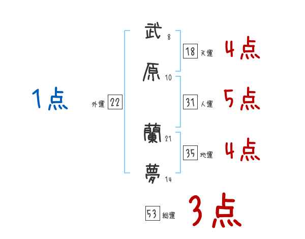 天運![]() | 武原蘭夢さんの天運は18画の4つ星!情熱的で剛気。忍耐力があり信頼される。 家系が持つ宿命的な運勢を表します。祖先から受け継いだ苗字ですので自分の力が及びません。家柄を象徴します。 |