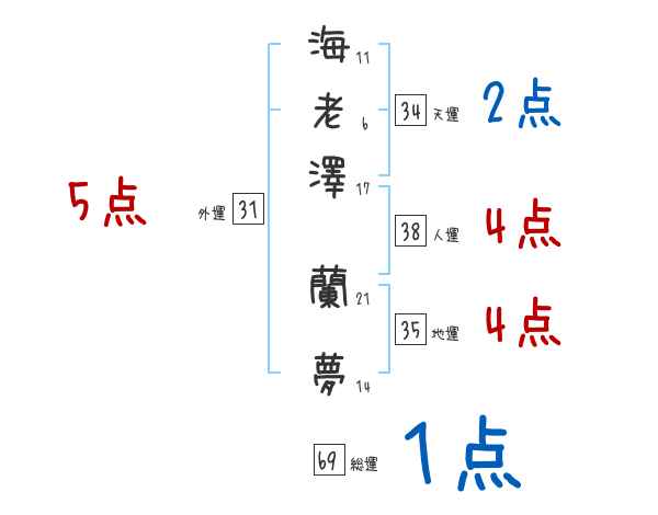 総運![]() | 海老澤蘭夢さんの総運は69画の1つ星!不満を感じやすい傾向が。ストレスを貯めないように注意しましょう。 あなたの人生を表す1番重要な運勢です。生涯を通じて影響する総合運となり、主に50歳以降の晩年期に影響を及ぼします。 |