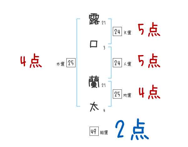 天運![]() | 露口蘭太さんの天運は24画の5つ星!家庭運が良く順調な人生。金運にも恵まれる。 家系が持つ宿命的な運勢を表します。祖先から受け継いだ苗字ですので自分の力が及びません。家柄を象徴します。 |