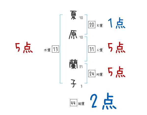 総運![]() | 夏原蘭子さんの総運は44画の2つ星!誠実で慎重な性格。物事を考えすぎないように注意しましょう。 あなたの人生を表す1番重要な運勢です。生涯を通じて影響する総合運となり、主に50歳以降の晩年期に影響を及ぼします。 |