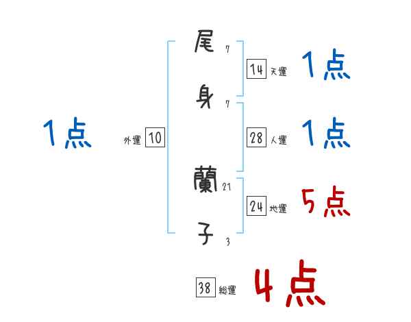 天運![]() | 尾身蘭子さんの天運は14画の1つ星!人に対して優しいがストレスを溜め込みがち。人間関係のトラブルを避けるよう気をつけましょう。 家系が持つ宿命的な運勢を表します。祖先から受け継いだ苗字ですので自分の力が及びません。家柄を象徴します。 |