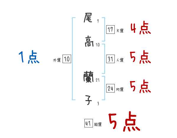 人運![]() | 尾高蘭子さんの人運は31画の5つ星!社交性があり判断力に優れる。順風満帆な人生で円満な生活。 性格や才能などを表す2番目に重要な運勢です。人間関係や協調性、社会的な成功に影響します。主に20歳から50歳ぐらいまでの中年期の運勢を表します。 |