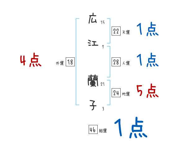 外運![]() | 広江蘭子さんの外運は18画の4つ星!情熱的で剛気。忍耐力があり信頼される。 生活面を象徴する運勢です。外部から受ける影響力を表し、結婚運、家庭運や職場、環境への順応性を表します。 |