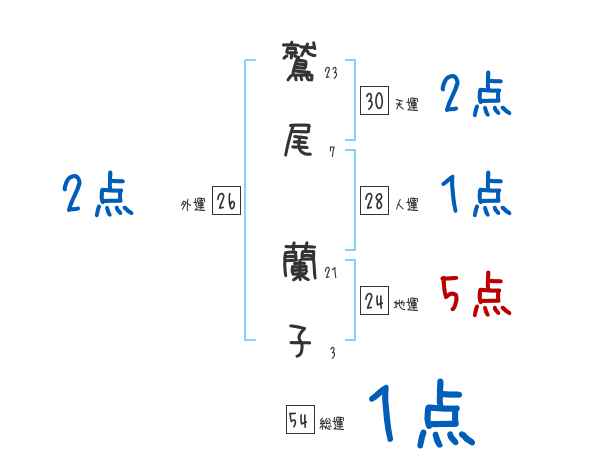 天運![]() | 鷲尾蘭子さんの天運は30画の2つ星!浮き沈みの激しさに注意しましょう。 家系が持つ宿命的な運勢を表します。祖先から受け継いだ苗字ですので自分の力が及びません。家柄を象徴します。 |