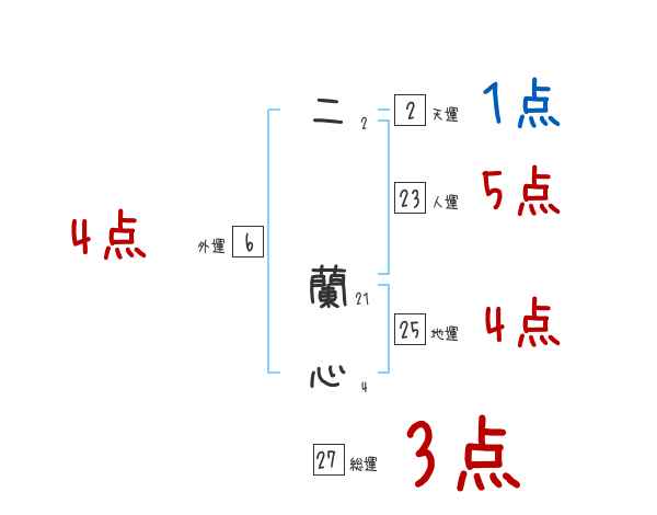 人運![]() | 二蘭心さんの人運は23画の5つ星!想像力に優れ活力がある。一代で成功し名誉を手に入れる。 性格や才能などを表す2番目に重要な運勢です。人間関係や協調性、社会的な成功に影響します。主に20歳から50歳ぐらいまでの中年期の運勢を表します。 |