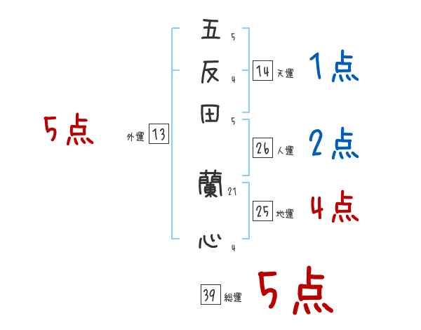 天運![]() | 五反田蘭心さんの天運は14画の1つ星!人に対して優しいがストレスを溜め込みがち。人間関係のトラブルを避けるよう気をつけましょう。 家系が持つ宿命的な運勢を表します。祖先から受け継いだ苗字ですので自分の力が及びません。家柄を象徴します。 |