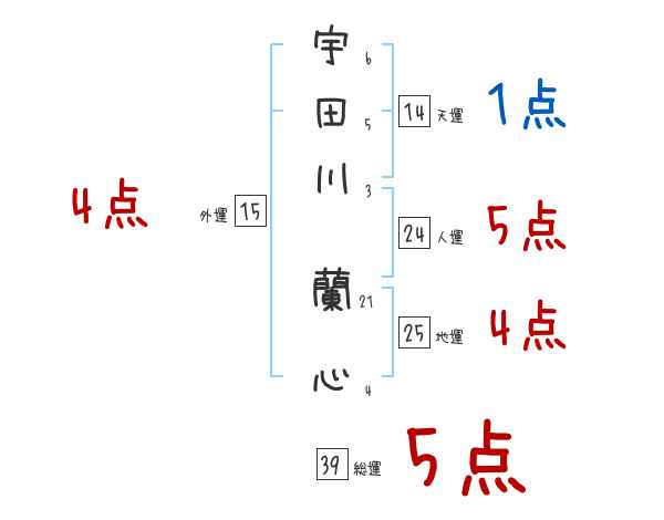 外運![]() | 宇田川蘭心さんの外運は15画の4つ星!人徳があり出世する。順調に物事を進め円満な人生。 生活面を象徴する運勢です。外部から受ける影響力を表し、結婚運、家庭運や職場、環境への順応性を表します。 |
