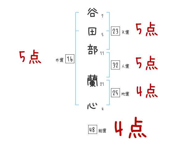人運![]() | 谷田部蘭心さんの人運は32画の5つ星!柔軟性があり成功する。チャンスが多く金運が良い。 性格や才能などを表す2番目に重要な運勢です。人間関係や協調性、社会的な成功に影響します。主に20歳から50歳ぐらいまでの中年期の運勢を表します。 |