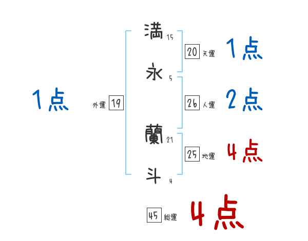 外運![]() | 満永蘭斗さんの外運は19画の1つ星!優れた才能を持ちますが、協調性が足りないことも。周りの人と協力する事を意識しましょう。 生活面を象徴する運勢です。外部から受ける影響力を表し、結婚運、家庭運や職場、環境への順応性を表します。 |