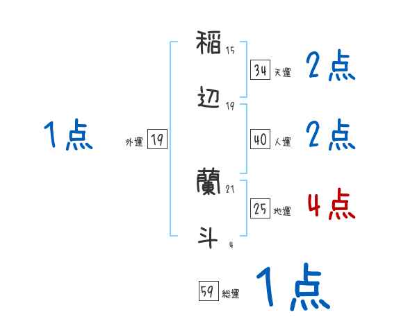 外運![]() | 稲辺蘭斗さんの外運は19画の1つ星!優れた才能を持ちますが、協調性が足りないことも。周りの人と協力する事を意識しましょう。 生活面を象徴する運勢です。外部から受ける影響力を表し、結婚運、家庭運や職場、環境への順応性を表します。 |