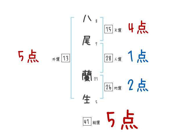 天運![]() | 八尾蘭生さんの天運は15画の4つ星!人徳があり出世する。順調に物事を進め円満な人生。 家系が持つ宿命的な運勢を表します。祖先から受け継いだ苗字ですので自分の力が及びません。家柄を象徴します。 |