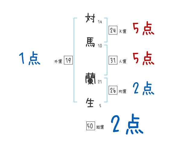 外運![]() | 対馬蘭生さんの外運は19画の1つ星!優れた才能を持ちますが、協調性が足りないことも。周りの人と協力する事を意識しましょう。 生活面を象徴する運勢です。外部から受ける影響力を表し、結婚運、家庭運や職場、環境への順応性を表します。 |