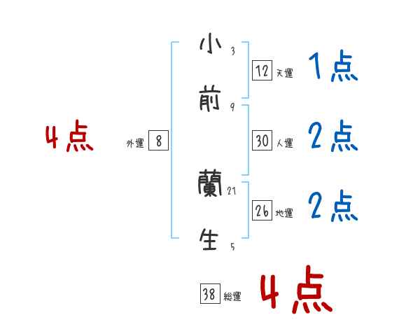 天運![]() | 小前蘭生さんの天運は12画の1つ星!簡単な失敗で諦めてしまいやすいかも。着実に行動すると良いでしょう。 家系が持つ宿命的な運勢を表します。祖先から受け継いだ苗字ですので自分の力が及びません。家柄を象徴します。 |