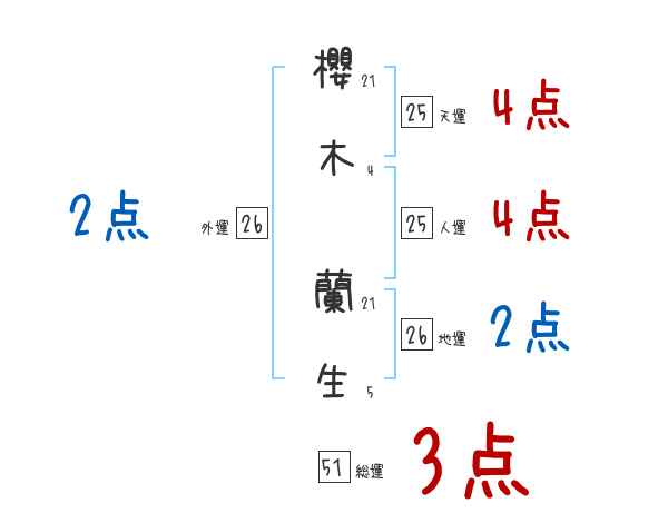 天運![]() | 櫻木蘭生さんの天運は25画の4つ星!個性があり才能があふれる。強運の持ち主で発展する。 家系が持つ宿命的な運勢を表します。祖先から受け継いだ苗字ですので自分の力が及びません。家柄を象徴します。 |
