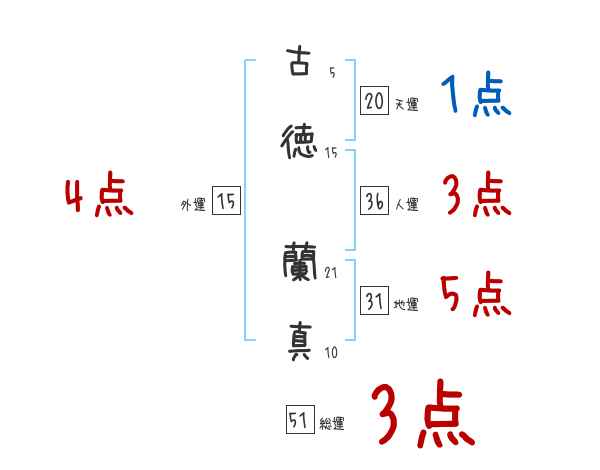 地運![]() | 古徳蘭真さんの地運は31画の5つ星!社交性があり判断力に優れる。順風満帆な人生で円満な生活。 個性を表す基礎的な運勢です。性格形成や対人関係、行動力など家庭環境に影響されます。主に誕生してから20歳くらいまでの若年期の運勢を表します。 |