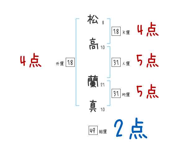 天運![]() | 松高蘭真さんの天運は18画の4つ星!情熱的で剛気。忍耐力があり信頼される。 家系が持つ宿命的な運勢を表します。祖先から受け継いだ苗字ですので自分の力が及びません。家柄を象徴します。 |