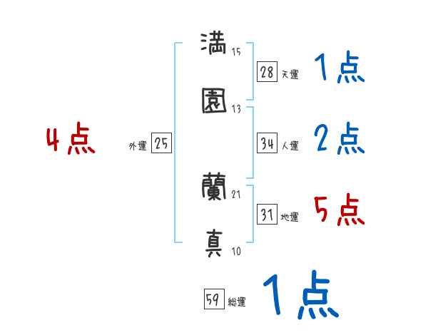 地運![]() | 満園蘭真さんの地運は31画の5つ星!社交性があり判断力に優れる。順風満帆な人生で円満な生活。 個性を表す基礎的な運勢です。性格形成や対人関係、行動力など家庭環境に影響されます。主に誕生してから20歳くらいまでの若年期の運勢を表します。 |