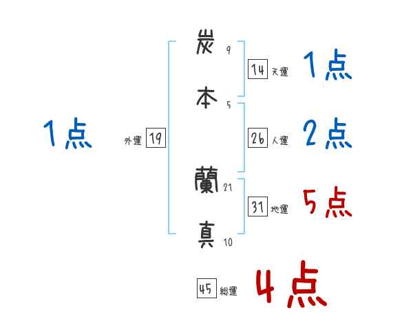天運![]() | 炭本蘭真さんの天運は14画の1つ星!人に対して優しいがストレスを溜め込みがち。人間関係のトラブルを避けるよう気をつけましょう。 家系が持つ宿命的な運勢を表します。祖先から受け継いだ苗字ですので自分の力が及びません。家柄を象徴します。 |