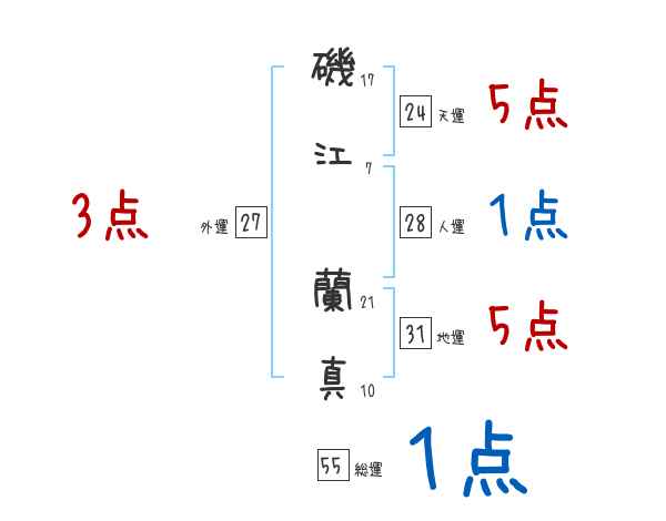人運![]() | 磯江蘭真さんの人運は28画の1つ星!家庭環境に注意。スポーツで活躍できる能力があるかも。 性格や才能などを表す2番目に重要な運勢です。人間関係や協調性、社会的な成功に影響します。主に20歳から50歳ぐらいまでの中年期の運勢を表します。 |
