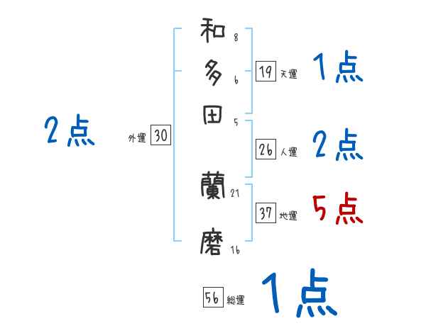 総運![]() | 和多田蘭磨さんの総運は56画の1つ星!消極的で無気力になりがち。誠実な気持ちが必要でしょう。 あなたの人生を表す1番重要な運勢です。生涯を通じて影響する総合運となり、主に50歳以降の晩年期に影響を及ぼします。 |