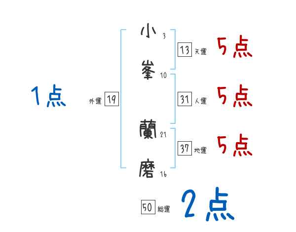 天運![]() | 小峯蘭磨さんの天運は13画の5つ星!才能に恵まれ人気がある。名声を手に入れる。円満な人生。 家系が持つ宿命的な運勢を表します。祖先から受け継いだ苗字ですので自分の力が及びません。家柄を象徴します。 |