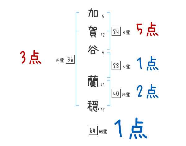 外運![]() | 加賀谷蘭穏さんの外運は36画の3つ星!先見性が豊かです。多少神経質で苦労することも。 生活面を象徴する運勢です。外部から受ける影響力を表し、結婚運、家庭運や職場、環境への順応性を表します。 |