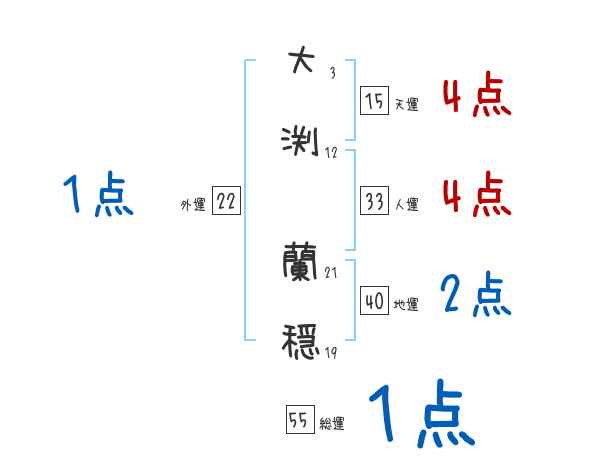 総運![]() | 大渕蘭穏さんの総運は55画の1つ星!欲張りな性格で軽率な行動に注意しましょう。病気に気をつけて。 あなたの人生を表す1番重要な運勢です。生涯を通じて影響する総合運となり、主に50歳以降の晩年期に影響を及ぼします。 |