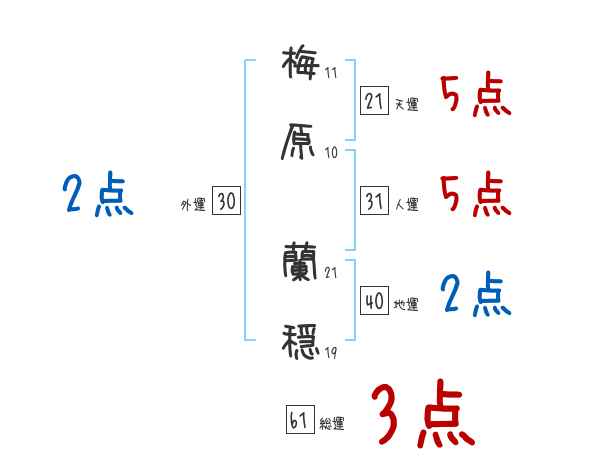 外運![]() | 梅原蘭穏さんの外運は30画の2つ星!浮き沈みの激しさに注意しましょう。 生活面を象徴する運勢です。外部から受ける影響力を表し、結婚運、家庭運や職場、環境への順応性を表します。 |