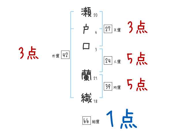 人運![]() | 瀬戸口蘭織さんの人運は24画の5つ星!家庭運が良く順調な人生。金運にも恵まれる。 性格や才能などを表す2番目に重要な運勢です。人間関係や協調性、社会的な成功に影響します。主に20歳から50歳ぐらいまでの中年期の運勢を表します。 |
