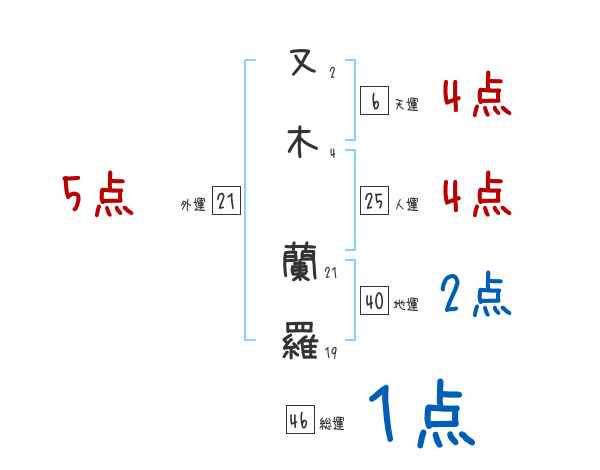 天運![]() | 又木蘭羅さんの天運は6画の4つ星!慎重な努力家で信頼を得る。誠実な精神で向上心に優れる。 家系が持つ宿命的な運勢を表します。祖先から受け継いだ苗字ですので自分の力が及びません。家柄を象徴します。 |