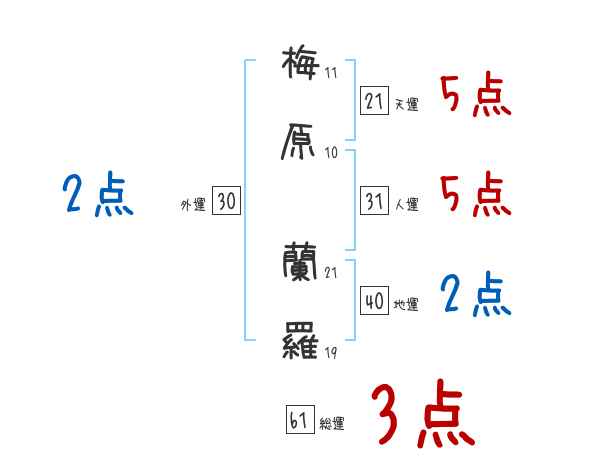 天運![]() | 梅原蘭羅さんの天運は21画の5つ星!統率力がある。独立し成功する。名誉を手に入れる。 家系が持つ宿命的な運勢を表します。祖先から受け継いだ苗字ですので自分の力が及びません。家柄を象徴します。 |