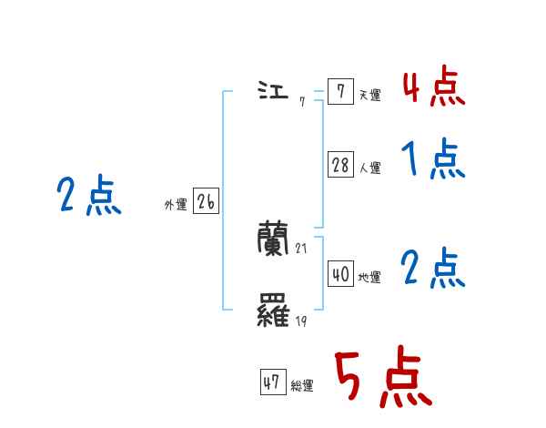 総運![]() | 江蘭羅さんの総運は47画の5つ星!実力が開花し発展する円満な人生。財に恵まれる。 あなたの人生を表す1番重要な運勢です。生涯を通じて影響する総合運となり、主に50歳以降の晩年期に影響を及ぼします。 |
