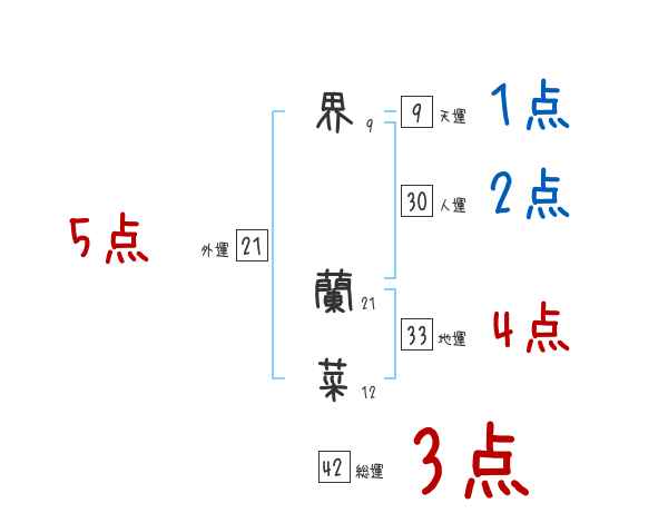 天運![]() | 界蘭菜さんの天運は9画の1つ星!消極的で才能を発揮することが苦手なことも。周りの意見に耳を傾けましょう。 家系が持つ宿命的な運勢を表します。祖先から受け継いだ苗字ですので自分の力が及びません。家柄を象徴します。 |