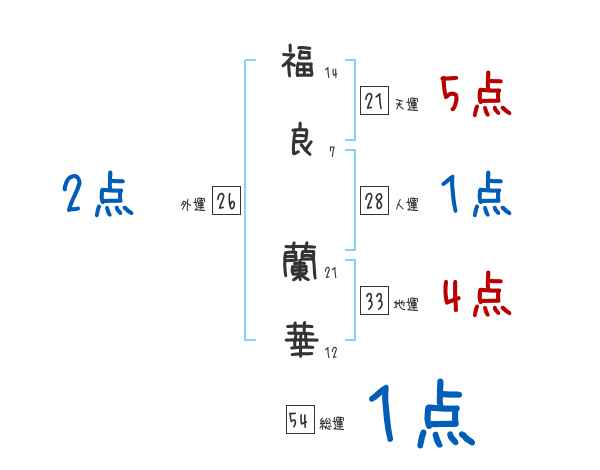 天運![]() | 福良蘭華さんの天運は21画の5つ星!統率力がある。独立し成功する。名誉を手に入れる。 家系が持つ宿命的な運勢を表します。祖先から受け継いだ苗字ですので自分の力が及びません。家柄を象徴します。 |