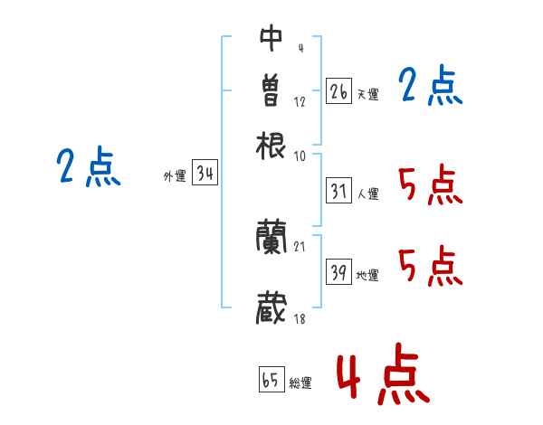 総運![]() | 中曽根蘭蔵さんの総運は65画の4つ星!幸運に恵まれ繁栄する。包容力がある。 あなたの人生を表す1番重要な運勢です。生涯を通じて影響する総合運となり、主に50歳以降の晩年期に影響を及ぼします。 |