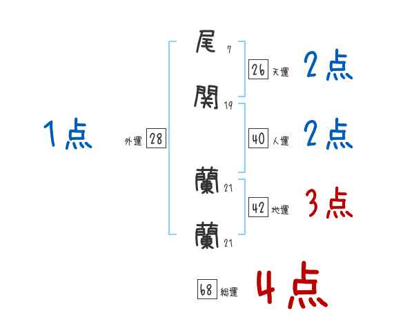 外運![]() | 尾関蘭蘭さんの外運は28画の1つ星!家庭環境に注意。スポーツで活躍できる能力があるかも。 生活面を象徴する運勢です。外部から受ける影響力を表し、結婚運、家庭運や職場、環境への順応性を表します。 |
